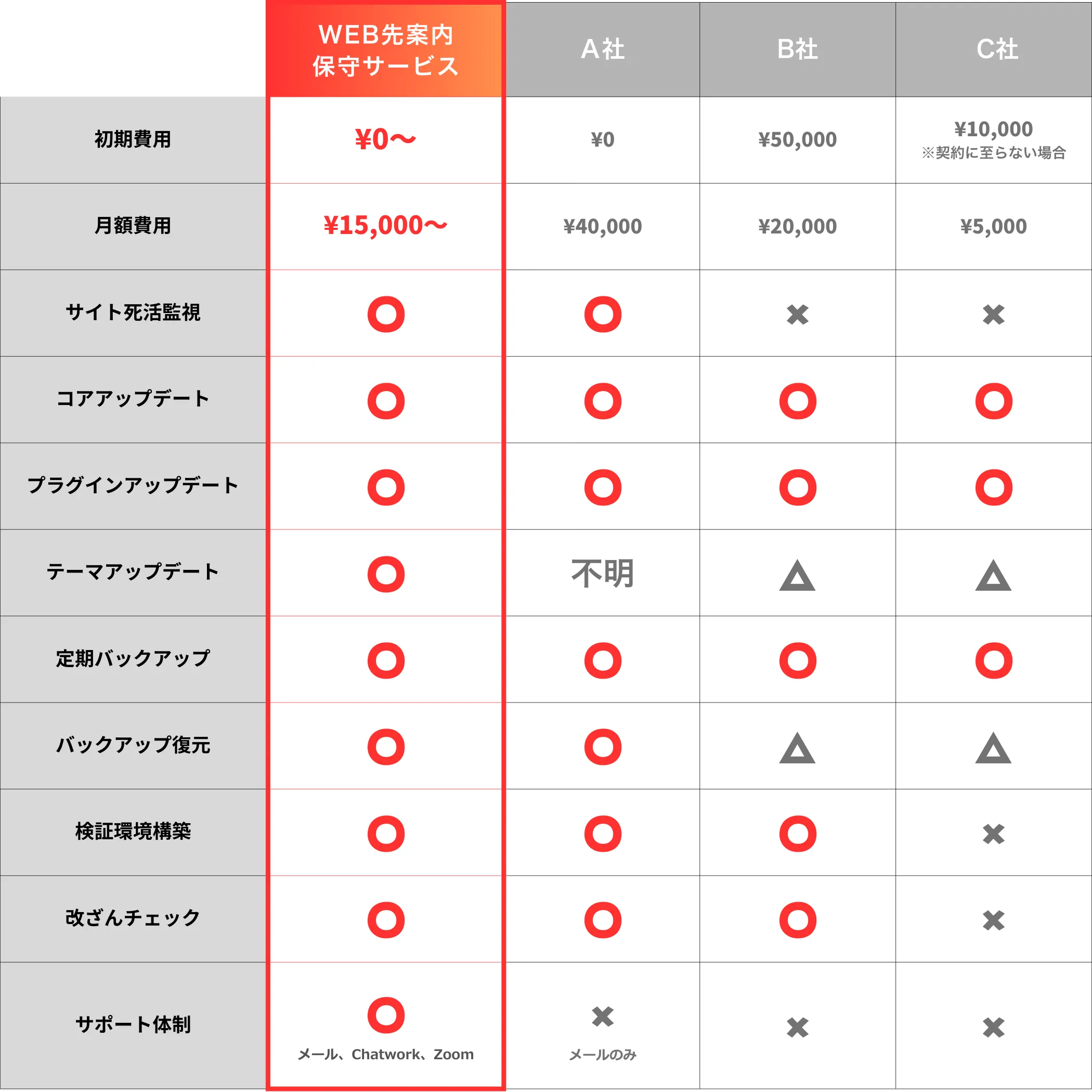 対象: WordPressの保守・運用(更新・バックアップ・監視・障害一次対応)の月額料金です。